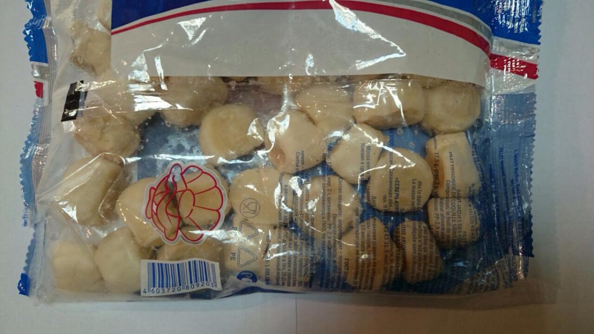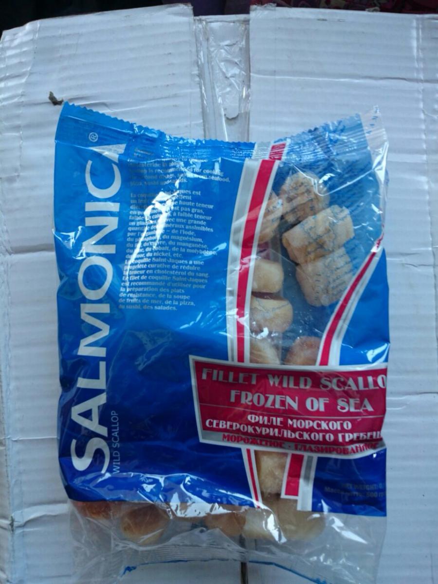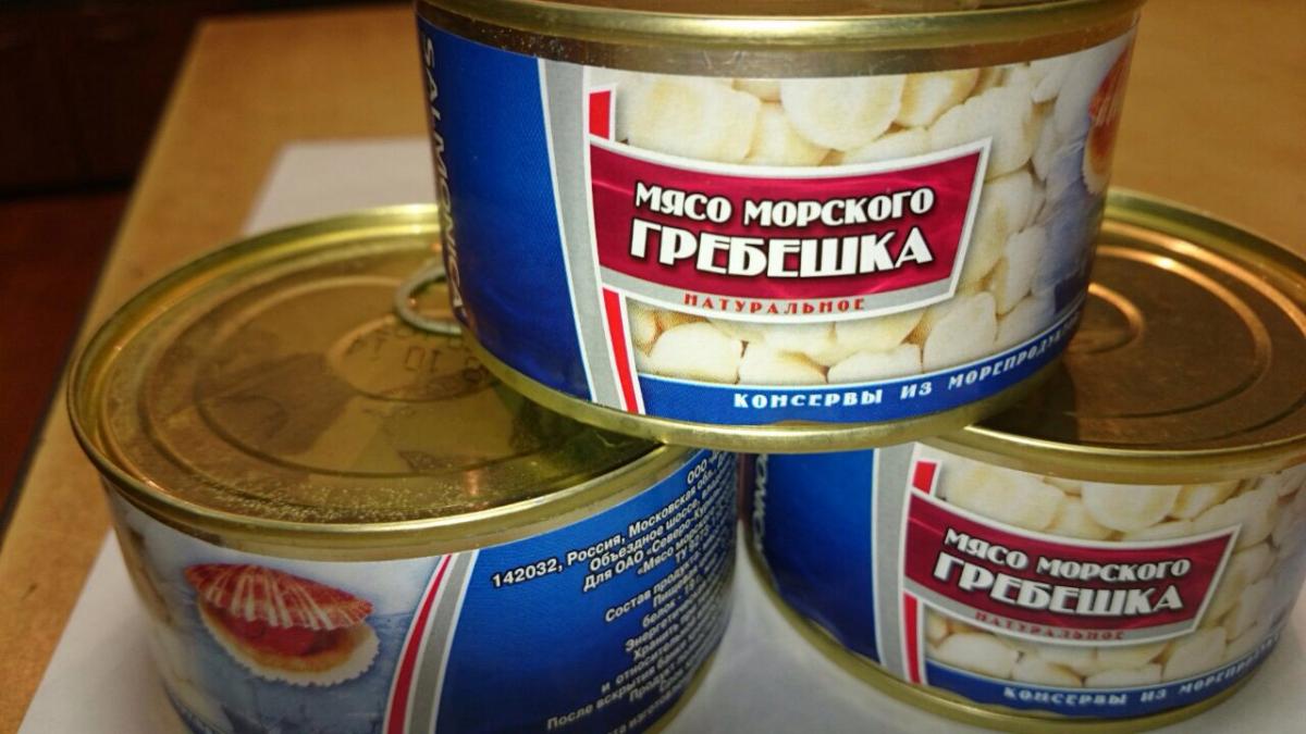 Гребешок поступил в двух видах: свежемороженый, расфасованный в пакеты по 0,5кг, и консервы из морского гребешка в собственном соку по 0,185 грамм.