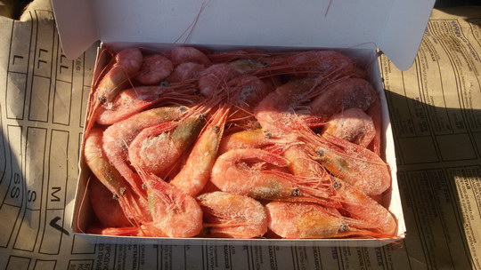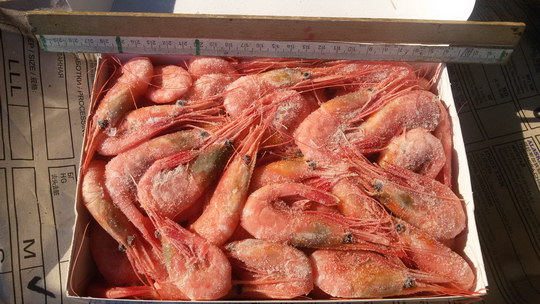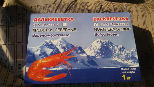 Креветки не выращены в садках, а выловлены в районе Магадана, их сварили в морской воде и сразу заморозили еще на корабле, не подвергая обработке фосфатами. Размерный ряд полностью соответствует заявленному – креветки не залиты тремя слоями глазури, а покрыты лишь ее тончайшим слоем – глазурь составляет менее 1% от общего объема. В одной коробке – двенадцать пачек весом по 1 килограмму каждая.