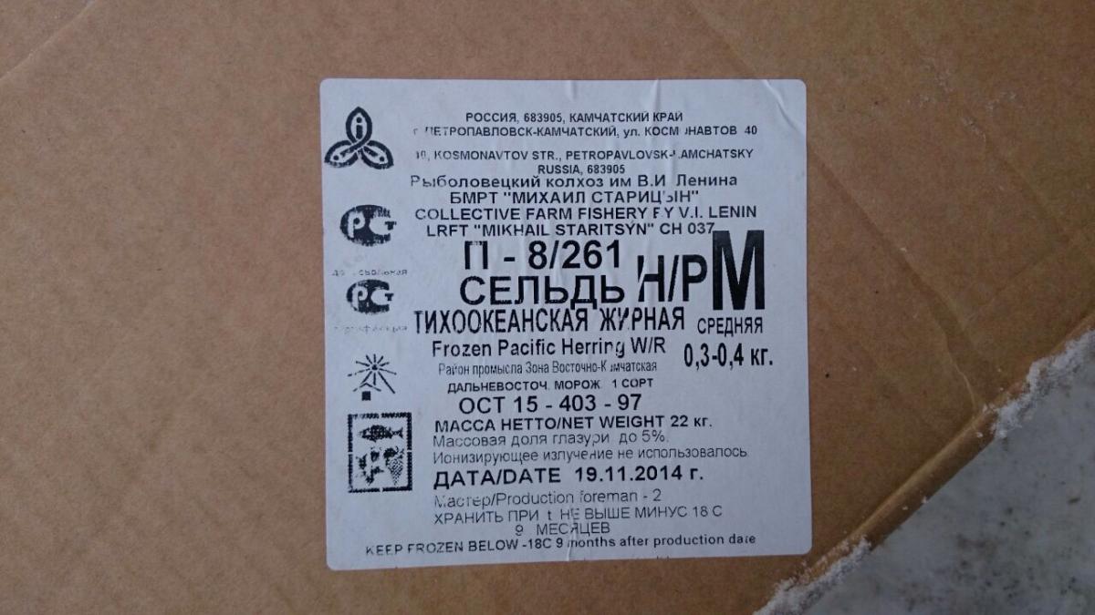Дата вылова олюторской селедки, которую покупатели могут купить в «100 морей» - конец ноября, начало декабря. Производитель – «Колхоз имени Ленина». Размерный ряд составляет 300-400 грамм, коробка 1/22.